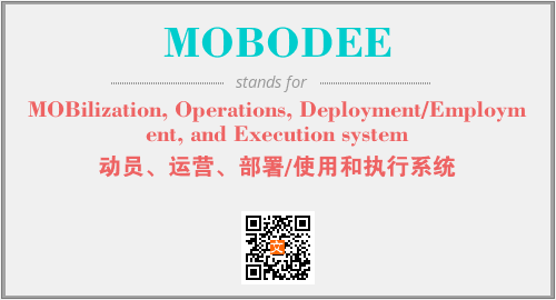 上述内容是“MOBilization, Operations, Deployment/Employment, and Execution system”作为“MOBODEE”的缩写,解释为“动员、运营、部署/使用和执行系统”时的信息,以及英文缩略词MOBODEE所代表的英文单词,其对应的中文拼音、详细解释以及在英文中的流行度和相关分类、应用领域及应用示例等。