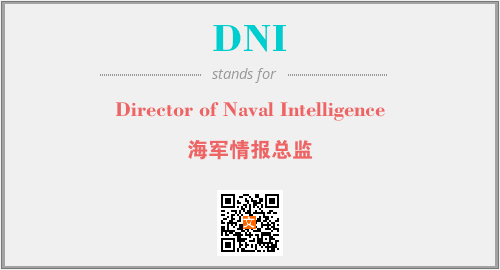 英文缩略词“DNI”经常作为“Director of Naval Intelligence”的英文缩写来使用,中文表示:“海军情报总监”。本文将详细介绍英文缩写词DNI所代表英文单词,其对应的中文拼音、详细解释以及在英语中的流行度。此外,还有关于缩略词DNI的分类、应用领域及相关应用示例等。