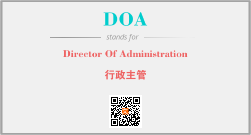 英文缩略词“DOA”经常作为“Director Of Administration”的英文缩写来使用,中文表示:“行政主管”。本文将详细介绍英文缩写词DOA所代表英文单词,其对应的中文拼音、详细解释以及在英语中的流行度。此外,还有关于缩略词DOA的分类、应用领域及相关应用示例等。