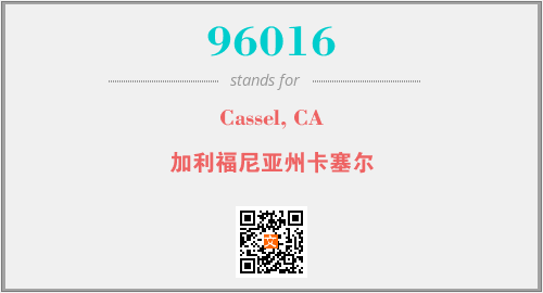 上述内容是“Cassel, CA”作为“96016”的缩写,解释为“加利福尼亚州卡塞尔”时的信息,以及英文缩略词96016所代表的英文单词,其对应的中文拼音、详细解释以及在英文中的流行度和相关分类、应用领域及应用示例等。