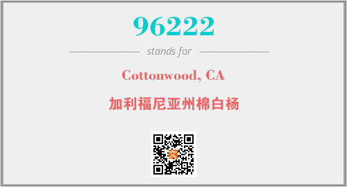 上述内容是“Cottonwood, CA”作为“96222”的缩写,解释为“加利福尼亚州棉白杨”时的信息,以及英文缩略词96222所代表的英文单词,其对应的中文拼音、详细解释以及在英文中的流行度和相关分类、应用领域及应用示例等。