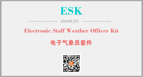 英文缩略词“ESK”经常作为“Electronic Staff Weather Officer Kit”的英文缩写来使用,中文表示:“电子气象员套件”。本文将详细介绍英文缩写词ESK所代表英文单词,其对应的中文拼音、详细解释以及在英语中的流行度。此外,还有关于缩略词ESK的分类、应用领域及相关应用示例等。