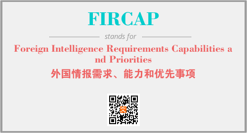 上述内容是“Foreign Intelligence Requirements Capabilities and Priorities”作为“FIRCAP”的缩写,解释为“外国情报需求、能力和优先事项”时的信息,以及英文缩略词FIRCAP所代表的英文单词,其对应的中文拼音、详细解释以及在英文中的流行度和相关分类、应用领域及应用示例等。