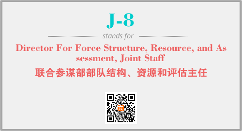 上述内容是“Director For Force Structure, Resource, and Assessment, Joint Staff”作为“J-8”的缩写,解释为“联合参谋部部队结构、资源和评估主任”时的信息,以及英文缩略词J-8所代表的英文单词,其对应的中文拼音、详细解释以及在英文中的流行度和相关分类、应用领域及应用示例等。