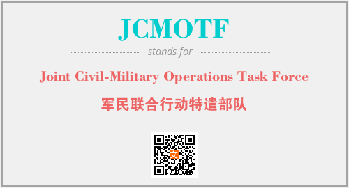 上述内容是“Joint Civil-Military Operations Task Force”作为“JCMOTF”的缩写,解释为“军民联合行动特遣部队”时的信息,以及英文缩略词JCMOTF所代表的英文单词,其对应的中文拼音、详细解释以及在英文中的流行度和相关分类、应用领域及应用示例等。
