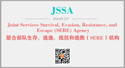 上述内容是“Joint Services Survival, Evasion, Resistance, and Escape (SERE) Agency”作为“JSSA”的缩写,解释为“联合部队生存、逃逸、抵抗和逃跑(SERE)机构”时的信息,以及英文缩略词JSSA所代表的英文单词,其对应的中文拼音、详细解释以及在英文中的流行度和相关分类、应用领域及应用示例等。