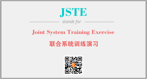上述内容是“Joint System Training Exercise”作为“JSTE”的缩写,解释为“联合系统训练演习”时的信息,以及英文缩略词JSTE所代表的英文单词,其对应的中文拼音、详细解释以及在英文中的流行度和相关分类、应用领域及应用示例等。