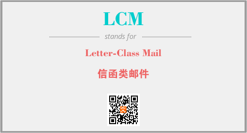 英文缩略词“LCM”经常作为“Letter-Class Mail”的英文缩写来使用,中文表示:“信函类邮件”。本文将详细介绍英文缩写词LCM所代表英文单词,其对应的中文拼音、详细解释以及在英语中的流行度。此外,还有关于缩略词LCM的分类、应用领域及相关应用示例等。