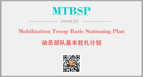 上述内容是“Mobilization Troop Basis Stationing Plan”作为“MTBSP”的缩写,解释为“动员部队基本驻扎计划”时的信息,以及英文缩略词MTBSP所代表的英文单词,其对应的中文拼音、详细解释以及在英文中的流行度和相关分类、应用领域及应用示例等。