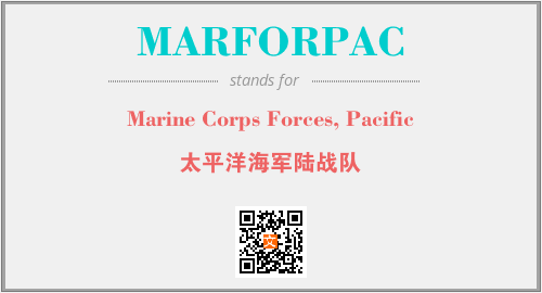 英文缩略词“MARFORPAC”经常作为“Marine Corps Forces, Pacific”的英文缩写来使用,中文表示:“太平洋海军陆战队”。本文将详细介绍英文缩写词MARFORPAC所代表英文单词,其对应的中文拼音、详细解释以及在英语中的流行度。此外,还有关于缩略词MARFORPAC的分类、应用领域及相关应用示例等。