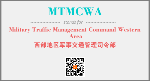 英文缩略词“MTMCWA”经常作为“Military Traffic Management Command Western Area”的英文缩写来使用,中文表示:“西部地区军事交通管理司令部”。本文将详细介绍英文缩写词MTMCWA所代表英文单词,其对应的中文拼音、详细解释以及在英语中的流行度。此外,还有关于缩略词MTMCWA的分类、应用领域及相关应用示例等。