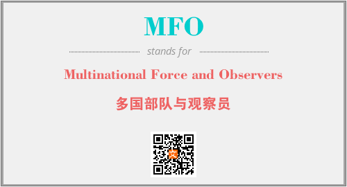 英文缩略词“MFO”经常作为“Multinational Force and Observers”的英文缩写来使用,中文表示:“多国部队与观察员”。本文将详细介绍英文缩写词MFO所代表英文单词,其对应的中文拼音、详细解释以及在英语中的流行度。此外,还有关于缩略词MFO的分类、应用领域及相关应用示例等。