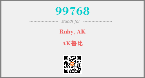 上述内容是“Ruby, AK”作为“99768”的缩写,解释为“AK鲁比”时的信息,以及英文缩略词99768所代表的英文单词,其对应的中文拼音、详细解释以及在英文中的流行度和相关分类、应用领域及应用示例等。