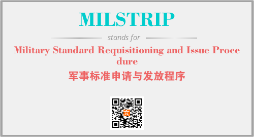 英文缩略词“MILSTRIP”经常作为“Military Standard Requisitioning and Issue Procedure”的英文缩写来使用,中文表示:“军事标准申请与发放程序”。本文将详细介绍英文缩写词MILSTRIP所代表英文单词,其对应的中文拼音、详细解释以及在英语中的流行度。此外,还有关于缩略词MILSTRIP的分类、应用领域及相关应用示例等。