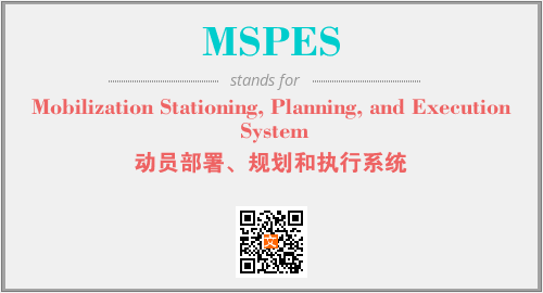 上述内容是“Mobilization Stationing, Planning, and Execution System”作为“MSPES”的缩写,解释为“动员部署、规划和执行系统”时的信息,以及英文缩略词MSPES所代表的英文单词,其对应的中文拼音、详细解释以及在英文中的流行度和相关分类、应用领域及应用示例等。