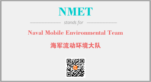 上述内容是“Naval Mobile Environmental Team”作为“NMET”的缩写,解释为“海军流动环境大队”时的信息,以及英文缩略词NMET所代表的英文单词,其对应的中文拼音、详细解释以及在英文中的流行度和相关分类、应用领域及应用示例等。