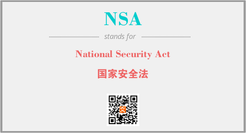 上述内容是“National Security Act”作为“NSA”的缩写,解释为“国家安全法”时的信息,以及英文缩略词NSA所代表的英文单词,其对应的中文拼音、详细解释以及在英文中的流行度和相关分类、应用领域及应用示例等。