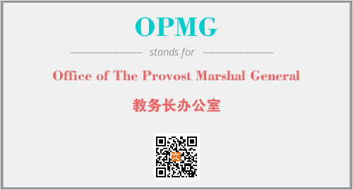 英文缩略词“OPMG”经常作为“Office of The Provost Marshal General”的英文缩写来使用,中文表示:“教务长办公室”。本文将详细介绍英文缩写词OPMG所代表英文单词,其对应的中文拼音、详细解释以及在英语中的流行度。此外,还有关于缩略词OPMG的分类、应用领域及相关应用示例等。