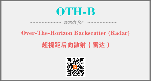 英文缩略词“OTH-B”经常作为“Over-The-Horizon Backscatter (Radar)”的英文缩写来使用,中文表示:“超视距后向散射(雷达)”。本文将详细介绍英文缩写词OTH-B所代表英文单词,其对应的中文拼音、详细解释以及在英语中的流行度。此外,还有关于缩略词OTH-B的分类、应用领域及相关应用示例等。