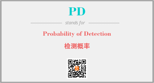 英文缩略词“PD”经常作为“Probability of Detection”的英文缩写来使用,中文表示:“检测概率”。本文将详细介绍英文缩写词PD所代表英文单词,其对应的中文拼音、详细解释以及在英语中的流行度。此外,还有关于缩略词PD的分类、应用领域及相关应用示例等。
