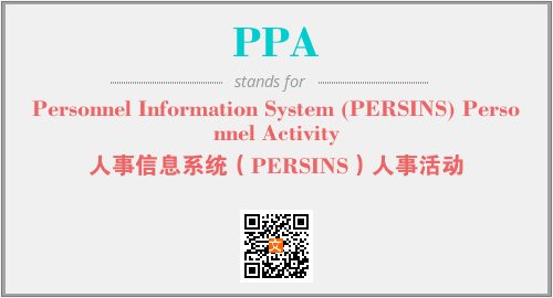 上述内容是“Personnel Information System (PERSINS) Personnel Activity”作为“PPA”的缩写,解释为“人事信息系统(PERSINS)人事活动”时的信息,以及英文缩略词PPA所代表的英文单词,其对应的中文拼音、详细解释以及在英文中的流行度和相关分类、应用领域及应用示例等。