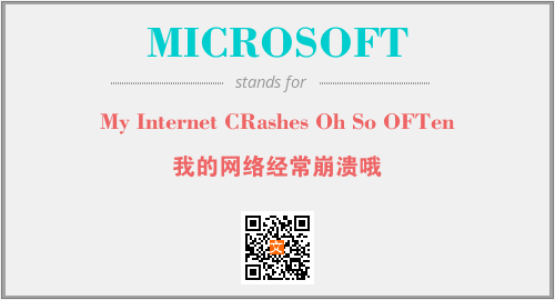 上述内容是“My Internet CRashes Oh So OFTen”作为“MICROSOFT”的缩写,解释为“我的网络经常崩溃哦”时的信息,以及英文缩略词MICROSOFT所代表的英文单词,其对应的中文拼音、详细解释以及在英文中的流行度和相关分类、应用领域及应用示例等。