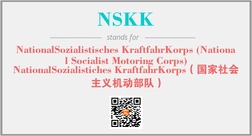 上述内容是“NationalSozialistisches KraftfahrKorps (National Socialist Motoring Corps)”作为“NSKK”的缩写,解释为“NationalSozialistiches KraftfahrKorps(国家社会主义机动部队)”时的信息,以及英文缩略词NSKK所代表的英文单词,其对应的中文拼音、详细解释以及在英文中的流行度和相关分类、应用领域及应用示例等。