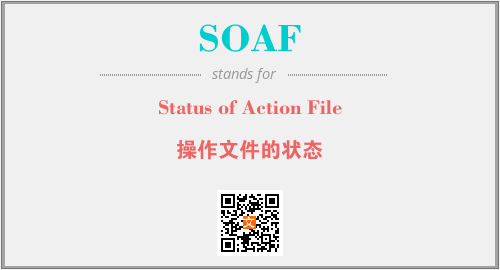 上述内容是“Status of Action File”作为“SOAF”的缩写,解释为“操作文件的状态”时的信息,以及英文缩略词SOAF所代表的英文单词,其对应的中文拼音、详细解释以及在英文中的流行度和相关分类、应用领域及应用示例等。
