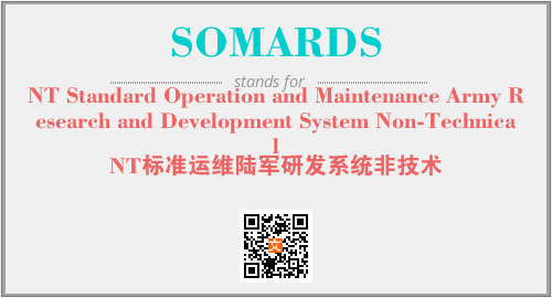 上述内容是“NT Standard Operation and Maintenance Army Research and Development System Non-Technical”作为“SOMARDS”的缩写,解释为“NT标准运维陆军研发系统非技术”时的信息,以及英文缩略词SOMARDS所代表的英文单词,其对应的中文拼音、详细解释以及在英文中的流行度和相关分类、应用领域及应用示例等。