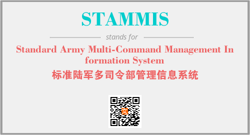 英文缩略词“STAMMIS”经常作为“Standard Army Multi-Command Management Information System”的英文缩写来使用,中文表示:“标准陆军多司令部管理信息系统”。本文将详细介绍英文缩写词STAMMIS所代表英文单词,其对应的中文拼音、详细解释以及在英语中的流行度。此外,还有关于缩略词STAMMIS的分类、应用领域及相关应用示例等。