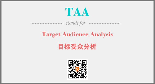 英文缩略词“TAA”经常作为“Target Audience Analysis”的英文缩写来使用,中文表示:“目标受众分析”。本文将详细介绍英文缩写词TAA所代表英文单词,其对应的中文拼音、详细解释以及在英语中的流行度。此外,还有关于缩略词TAA的分类、应用领域及相关应用示例等。