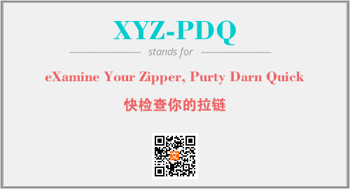 英文缩略词“XYZ-PDQ”经常作为“eXamine Your Zipper, Purty Darn Quick”的英文缩写来使用,中文表示:“快检查你的拉链”。本文将详细介绍英文缩写词XYZ-PDQ所代表英文单词,其对应的中文拼音、详细解释以及在英语中的流行度。此外,还有关于缩略词XYZ-PDQ的分类、应用领域及相关应用示例等。