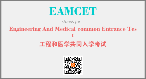 英文缩略词“EAMCET”经常作为“Engineering And Medical common Entrance Test”的英文缩写来使用,中文表示:“工程和医学共同入学考试”。本文将详细介绍英文缩写词EAMCET所代表英文单词,其对应的中文拼音、详细解释以及在英语中的流行度。此外,还有关于缩略词EAMCET的分类、应用领域及相关应用示例等。