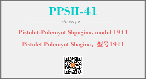 英文缩略词“PPSH-41”经常作为“Pistolet-Pulemyot Shpagina, model 1941”的英文缩写来使用,中文表示:“Pistolet Pulemyot Shagina,型号1941”。本文将详细介绍英文缩写词PPSH-41所代表英文单词,其对应的中文拼音、详细解释以及在英语中的流行度。此外,还有关于缩略词PPSH-41的分类、应用领域及相关应用示例等。