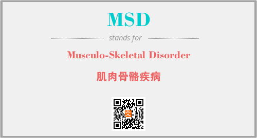 上述内容是“Musculo-Skeletal Disorder”作为“MSD”的缩写,解释为“肌肉骨骼疾病”时的信息,以及英文缩略词MSD所代表的英文单词,其对应的中文拼音、详细解释以及在英文中的流行度和相关分类、应用领域及应用示例等。