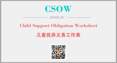 上述内容是“Child Support Obligation Worksheet”作为“CSOW”的缩写,解释为“儿童抚养义务工作表”时的信息,以及英文缩略词CSOW所代表的英文单词,其对应的中文拼音、详细解释以及在英文中的流行度和相关分类、应用领域及应用示例等。