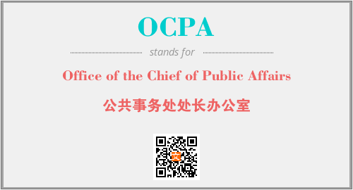上述内容是“Office of the Chief of Public Affairs”作为“OCPA”的缩写,解释为“公共事务处处长办公室”时的信息,以及英文缩略词OCPA所代表的英文单词,其对应的中文拼音、详细解释以及在英文中的流行度和相关分类、应用领域及应用示例等。