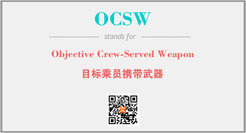 英文缩略词“OCSW”经常作为“Objective Crew-Served Weapon”的英文缩写来使用,中文表示:“目标乘员携带武器”。本文将详细介绍英文缩写词OCSW所代表英文单词,其对应的中文拼音、详细解释以及在英语中的流行度。此外,还有关于缩略词OCSW的分类、应用领域及相关应用示例等。