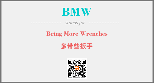 英文缩略词“BMW”经常作为“Bring More Wrenches”的英文缩写来使用,中文表示:“多带些扳手”。本文将详细介绍英文缩写词BMW所代表英文单词,其对应的中文拼音、详细解释以及在英语中的流行度。此外,还有关于缩略词BMW的分类、应用领域及相关应用示例等。