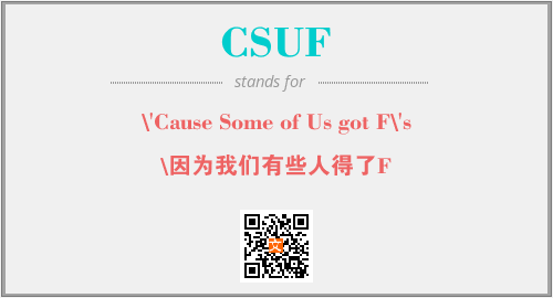英文缩略词“CSUF”经常作为“\'Cause Some of Us got F\'s”的英文缩写来使用,中文表示:“\因为我们有些人得了F”。本文将详细介绍英文缩写词CSUF所代表英文单词,其对应的中文拼音、详细解释以及在英语中的流行度。此外,还有关于缩略词CSUF的分类、应用领域及相关应用示例等。