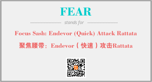 上述内容是“Focus Sash: Endevor (Quick) Attack Rattata”作为“FEAR”的缩写,解释为“聚焦腰带:Endevor(快速)攻击Rattata”时的信息,以及英文缩略词FEAR所代表的英文单词,其对应的中文拼音、详细解释以及在英文中的流行度和相关分类、应用领域及应用示例等。