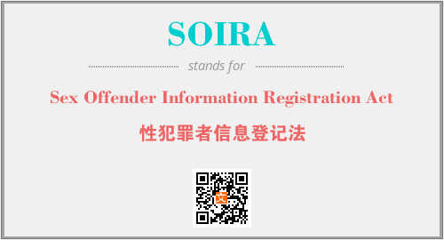 上述内容是“Sex Offender Information Registration Act”作为“SOIRA”的缩写,解释为“性犯罪者信息登记法”时的信息,以及英文缩略词SOIRA所代表的英文单词,其对应的中文拼音、详细解释以及在英文中的流行度和相关分类、应用领域及应用示例等。