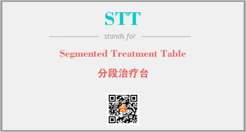 上述内容是“Segmented Treatment Table”作为“STT”的缩写,解释为“分段治疗台”时的信息,以及英文缩略词STT所代表的英文单词,其对应的中文拼音、详细解释以及在英文中的流行度和相关分类、应用领域及应用示例等。