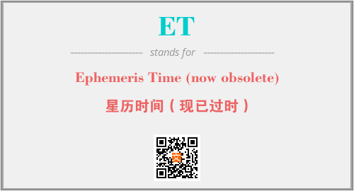 上述内容是“Ephemeris Time (now obsolete)”作为“ET”的缩写,解释为“星历时间(现已过时)”时的信息,以及英文缩略词ET所代表的英文单词,其对应的中文拼音、详细解释以及在英文中的流行度和相关分类、应用领域及应用示例等。