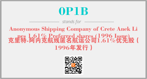 上述内容是“Anonymous Shipping Company of Crete Anek Lines 1.61% Preferred shares (1996 Issue)”作为“0P1B”的缩写,解释为“克里特-阿内克航线匿名航运公司1.61%优先股(1996年发行)”时的信息,以及英文缩略词0P1B所代表的英文单词,其对应的中文拼音、详细解释以及在英文中的流行度和相关分类、应用领域及应用示例等。