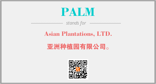 上述内容是“Asian Plantations, LTD.”作为“PALM”的缩写,解释为“亚洲种植园有限公司。”时的信息,以及英文缩略词PALM所代表的英文单词,其对应的中文拼音、详细解释以及在英文中的流行度和相关分类、应用领域及应用示例等。