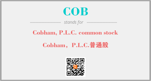 英文缩略词“COB”经常作为“Cobham, P.L.C. common stock”的英文缩写来使用,中文表示:“Cobham,P.L.C.普通股”。本文将详细介绍英文缩写词COB所代表英文单词,其对应的中文拼音、详细解释以及在英语中的流行度。此外,还有关于缩略词COB的分类、应用领域及相关应用示例等。