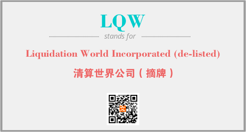英文缩略词“LQW”经常作为“Liquidation World Incorporated (de-listed)”的英文缩写来使用,中文表示:“清算世界公司(摘牌)”。本文将详细介绍英文缩写词LQW所代表英文单词,其对应的中文拼音、详细解释以及在英语中的流行度。此外,还有关于缩略词LQW的分类、应用领域及相关应用示例等。