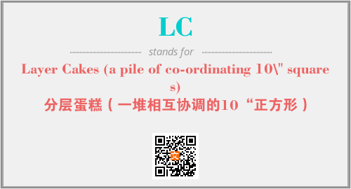 上述内容是“Layer Cakes (a pile of co-ordinating 10\" squares)”作为“LC”的缩写,解释为“分层蛋糕(一堆相互协调的10“正方形)”时的信息,以及英文缩略词LC所代表的英文单词,其对应的中文拼音、详细解释以及在英文中的流行度和相关分类、应用领域及应用示例等。