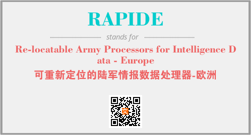 上述内容是“Re-locatable Army Processors for Intelligence Data - Europe”作为“RAPIDE”的缩写,解释为“可重新定位的陆军情报数据处理器-欧洲”时的信息,以及英文缩略词RAPIDE所代表的英文单词,其对应的中文拼音、详细解释以及在英文中的流行度和相关分类、应用领域及应用示例等。